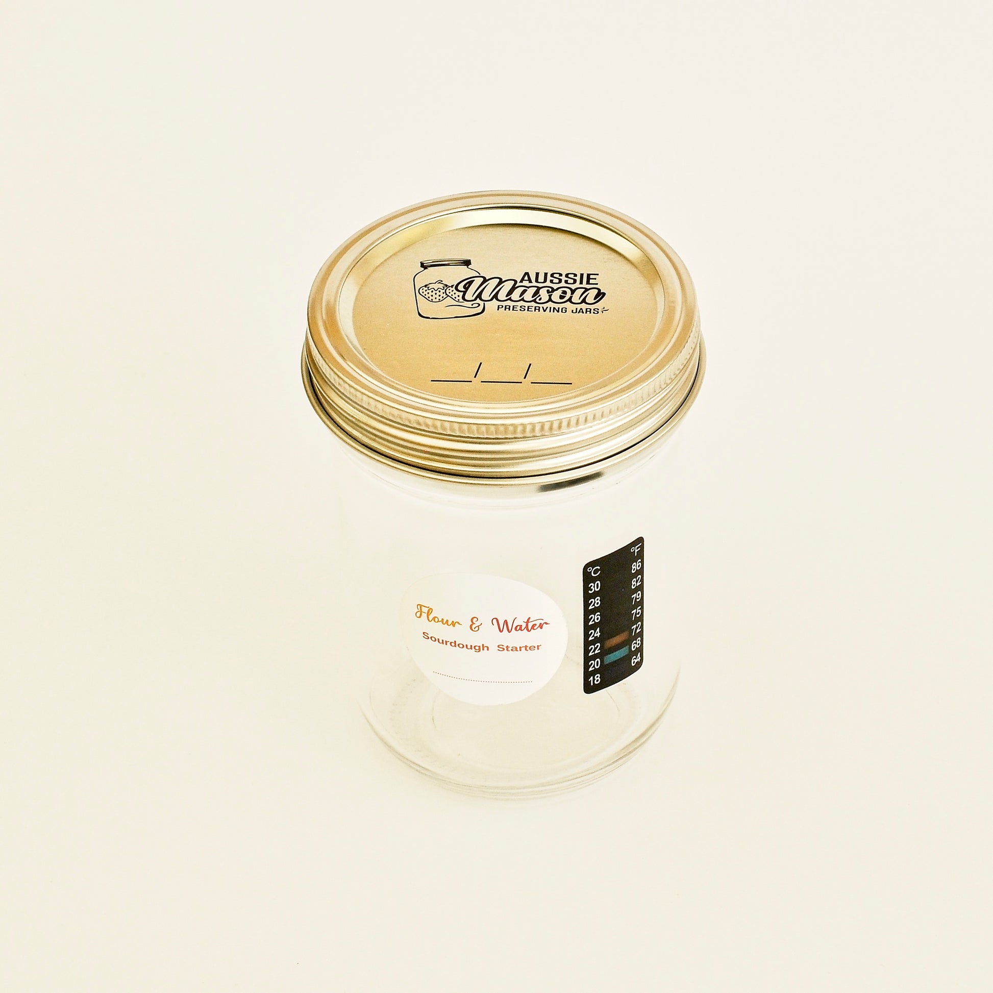 The jar comes with a stick-on thermometer to ensure perfect growing conditions for your sourdough starter. Ideally, keep it in 20-25C. If you want to give your starter a unique name, there's a heavy duty waterproof sticker, too!